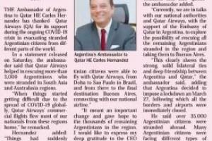The Ambassador of Argentina to Qatar HE Carlos Hernandez has thanked Qatar Airways (QA) for its support during the ongoing COVID-19 crisis in evacuating stranded Argentinian citizens from different parts of the world. In a statement released on Saturday, the ambassador said that Qatar Airways helped in rescuing more than 3,000 Argentinians who were stranded in South Asia and Australasia regions.